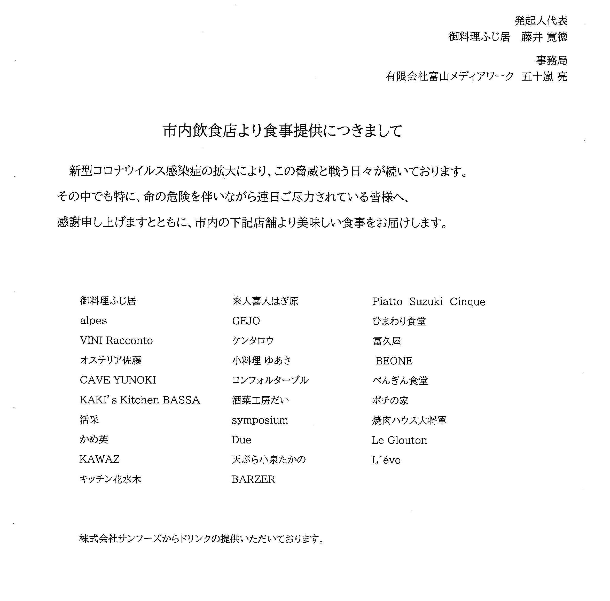 新型コロナウイルスと日々闘っている富山県内の医療従事者と飲食店を支援するため、県内有志飲食店がローテーションで1日50食を医療機関へ届けるプロジェクトが立ち上がりました。