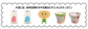 ●3食バランスの良い食事をとりましょう。特に、豚肉や大豆に含まれるビタミンB1は疲労回復に効果的です。積極的に摂取しましょう。