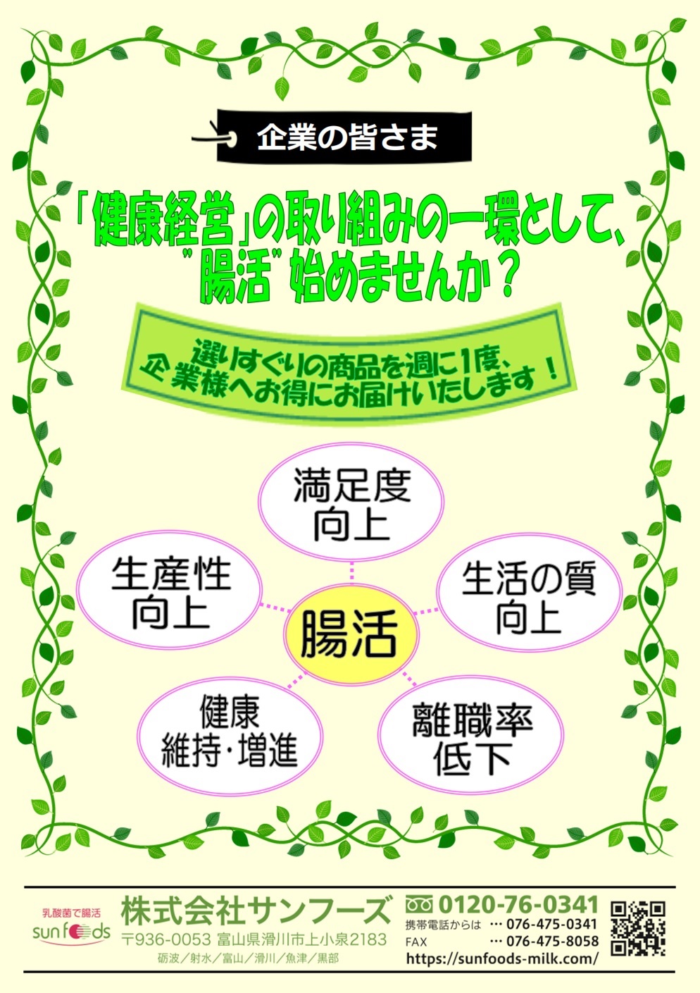(株)サンフーズが、従業員の皆様の健康づくりを「腸活」でサポートさせていただきます。
