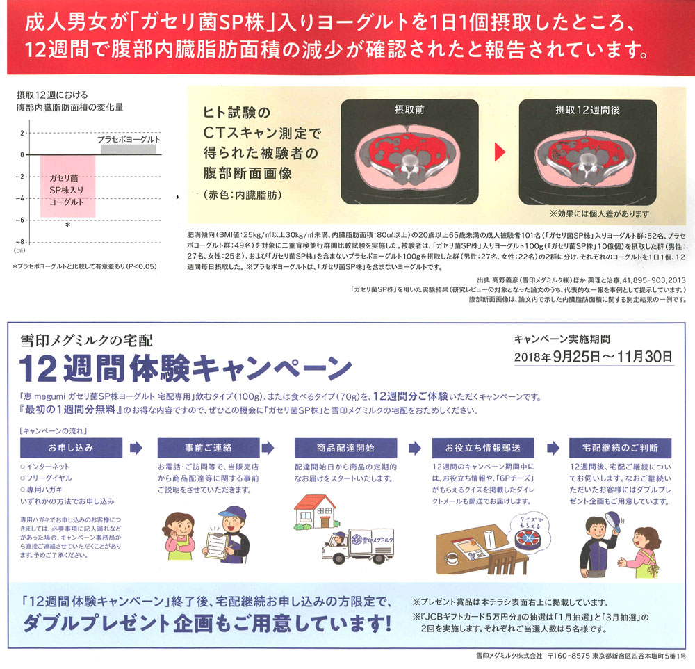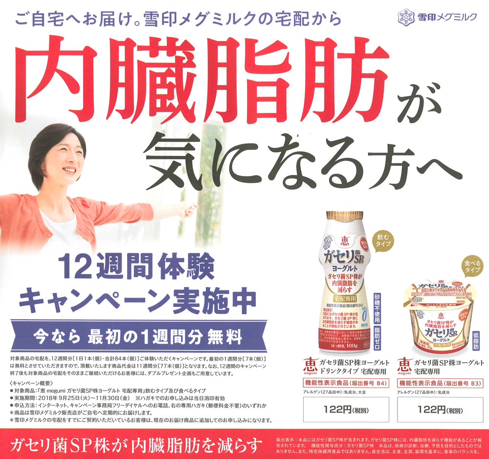 サンフーズでは9月25日から11月30日まで、”内臓脂肪が気になる方にお勧め”、雪印メグミルク「恵 megumi ガセリ菌SP株ヨーグルト 宅配専用」12週間体験キャンペーンを実施しております。