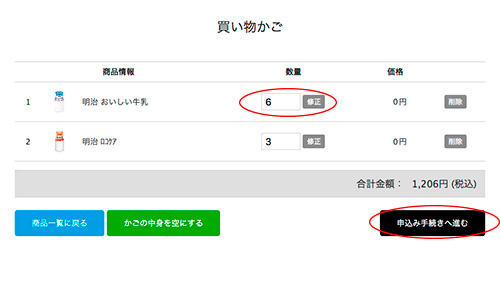 商品・数量をご確認のうえ、[申込み手続きへ進む]をクリックしてください。