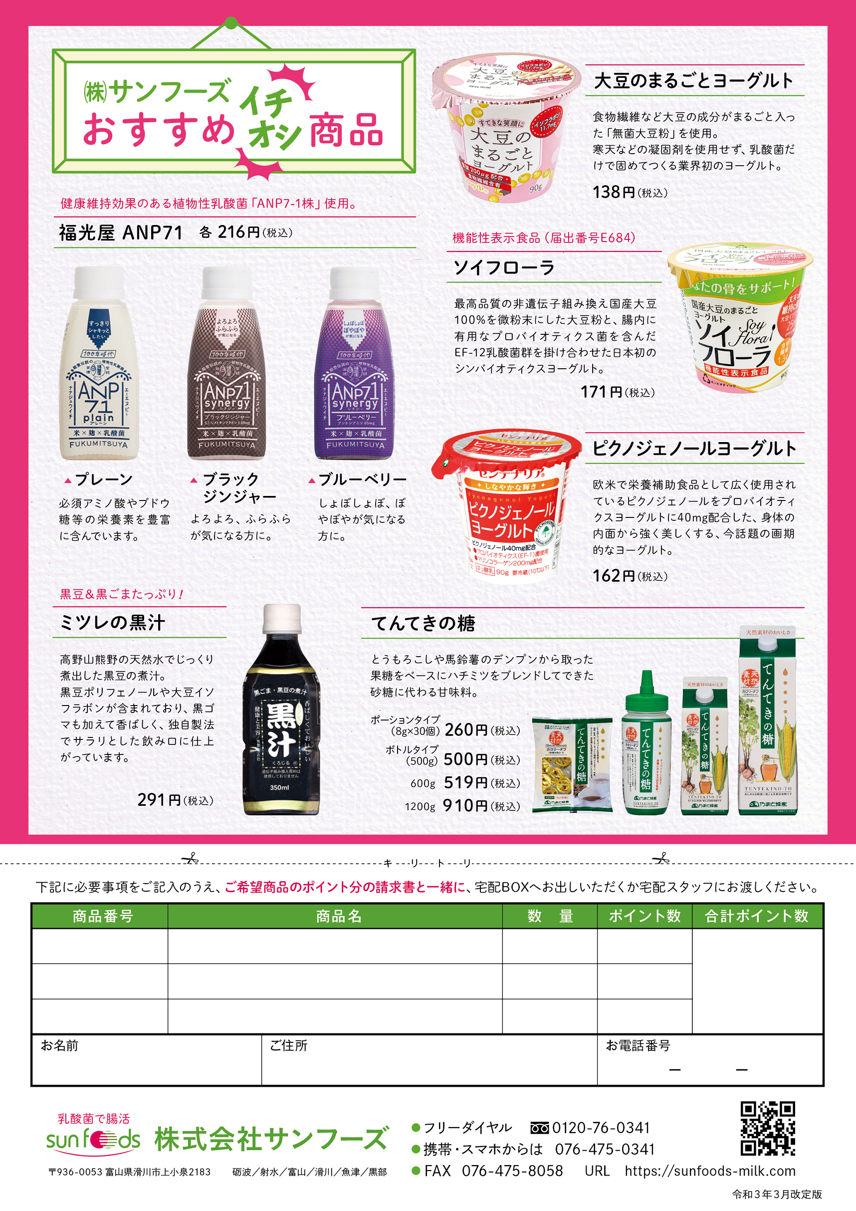 宅配サービスでは、スーパーやコンビニの店頭では買えない、宅配専用商品を多数ラインナップ。サンフーズでは様々なメーカーの商品をお届けできるので、牛乳やヨーグルトだけではなく、黒酢や青汁・野菜ジュースなど、ご家族それぞれの皆様の目的にあったサポートをさせていただきます。
